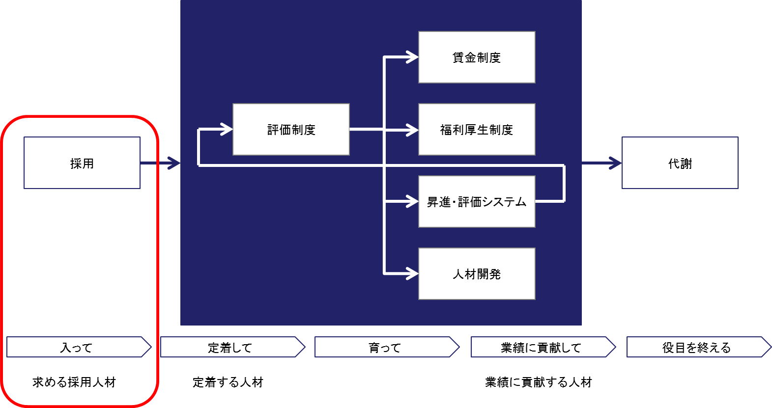 人材フローを入社から退社までの全体像で考えると、簡単には入口の採用システム、就業期間の人材マネジメントシステム、代謝設計(退社設計)の排出システムで、整理することができ、その入り口部分を採用システムがコントロールしています。
